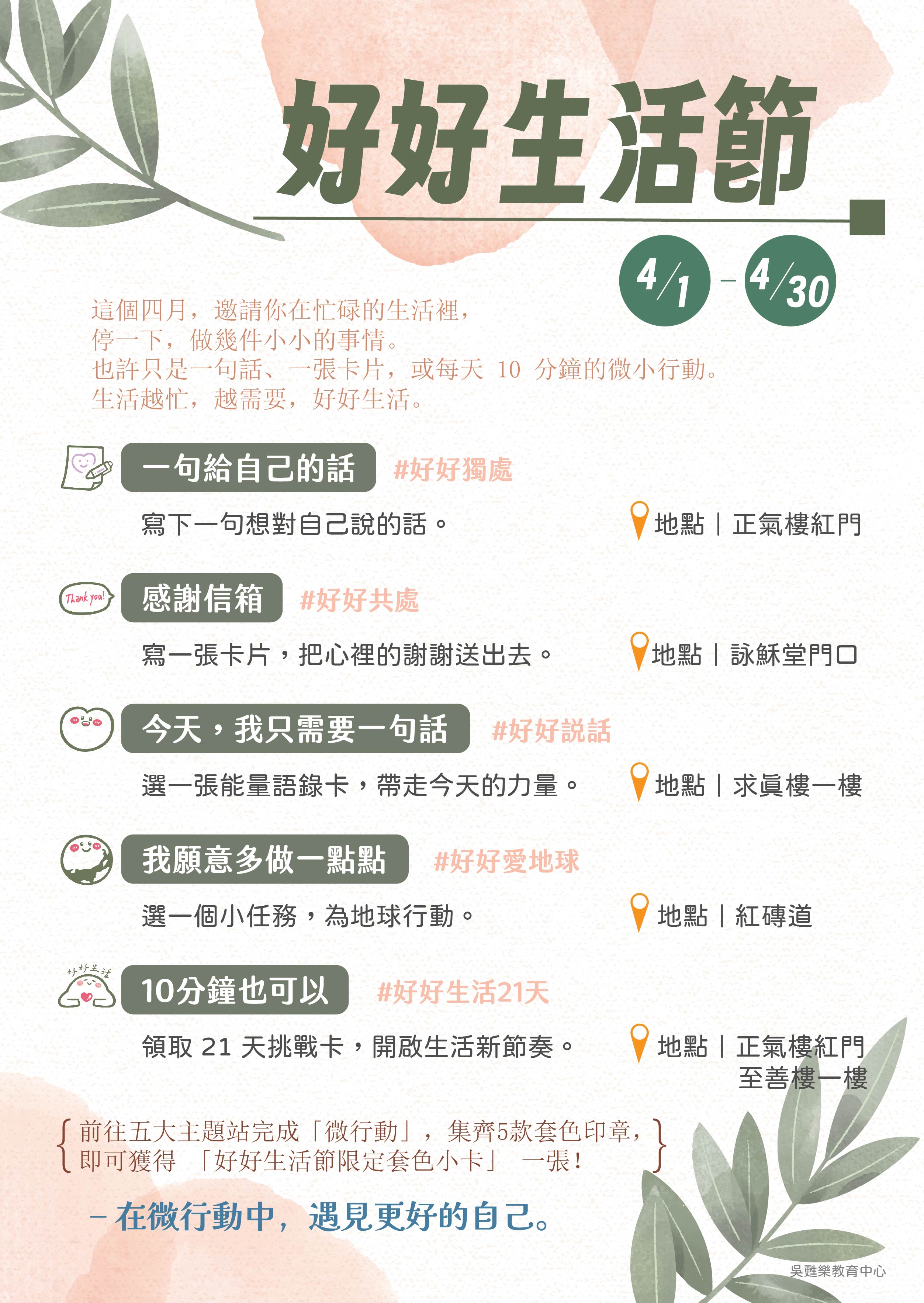 今年四月,吳甦樂教育中心以復活節「更新與希望」的精神出發,規劃「好好生活節」系列活動,邀請同學透過簡單、可行的日常行動,在生活中練習覺察、連結與改變。
